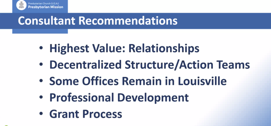 Decentralization. If the board approves the recommendations, PMA would have a flattened and decentralized structure – with fewer employees working at the PC(USA) offices in in Louisville. A point of context: the PC(USA) is currently committed to a $2.4 million renovation of the first floor of that building, to accommodate committee meetings for the hybrid 2022 General Assembly.
