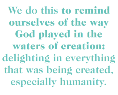 Each Sunday, we pour the waters reminiscent of our baptisms. We make it a point to play in the water — to splish-splash and make a mess. We do this to remind ourselves of the way God played in the waters of creation: delighting in everything that was being created, especially humanity. The water of our baptism is where God claims us and where we are known. From the waters, we receive our original name; Sophia invites us to join her as she plays in creation. The play she inspires isn’t one of domination or competition. Rather, she invites us to play with mercy and gentleness, tenderness and love! When we play, we put down our expectations and set aside our fears. When we remove our masks and let go of our restrictions, we enter deeper into the mystery of the Trinity and receive a renewed sense of God’s nearness and friendship.