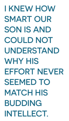 This frustration would often bubble up again at home when I’d ask him to find his shoes to get ready for school or karate class. He would acknowledge hearing me with a nod, then promptly get sidetracked on the way to or from his room by something more worthy of his attention — a cartoon on the TV, a book on the floor, a pile of Legos on a table. This went on for several years. I tallied more mom meltdowns than I care to admit while I blamed my child for being a terrible listener and direction follower. Anxiety over being late began to mount, and an undercurrent of worry grew over time. I knew raising a son is typically different from raising a daughter. I knew how smart our son is and could not understand why his effort never seemed to match his budding intellect.