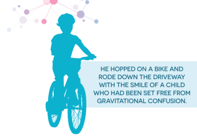 The answers we got that day in second grade also shed light on something entirely new. Our son’s vestibular balance affects his fine motor skills. Those botched bike rides and tears of frustration? Now I know his position in space on that bike was intimidating because he experiences balance in the same way that I might if I were trying to drink orange juice while dancing on a balance beam. We sometimes get to experience this sensation after a bad ear infection or when we get off of a ride that spins us too hard or too fast.