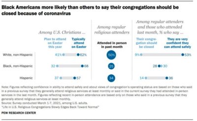 More than a quarter (28%) of Black people who regularly attend services said their congregations should be closed due to the pandemic, compared to 9% of white people and 14% of Hispanic Americans. Similarly, fewer African American congregants (30%) said they were “very confident they can attend safely,” compared to 36% of Hispanic attendees and 53% of white attendees.