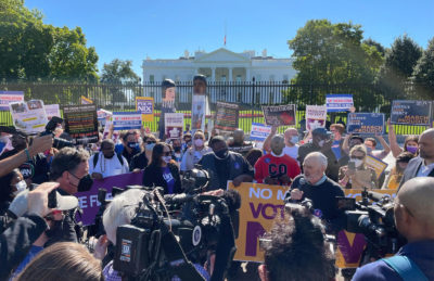 “I’ve known Joe Biden for 40 years,” Saperstein told the crowd before his arrest. “All his life he has fought for voting rights. … Which is why we expect him, above all, to stand up and to make this a priority even among other enormously important priorities. This is the bedrock foundational right.”