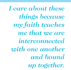 I care about these things because my faith teaches me that we are interconnected with one another and bound up together. Our faith teaches that in God’s promised day, the poor will inherit the kingdom and the peacemakers will be called children of God, there will be no mourning and crying and we will be stewards of this good creation. I want my engagement with my church, the place that nurtures my discipleship, to help me navigate these changing cultural waters and these urgent needs in the life of my community.