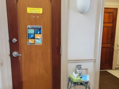 Maintaining the community bathroom comes with challenges, like ensuring it is cleaned several times a day. Sometimes supplies go missing, people taking the extra rolls of toilet paper or paper towel refills. Not all visitors understand that the bathroom is “for the basics only” and try to use the space to do a full body wash.
