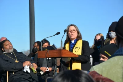 The Rev. Susan Frederick-Gray, president of the Unitarian Universalist Association, told the crowd, “I’m here representing 1,000 Unitarian Universalist congregations across the country who hold democracy, the right to vote and the quality and dignity of every single life as sacred. We demand that the Senate pass the Build Back Better Act for all people. All children and families deserve a healthy life, economic stability and the opportunity to thrive.”