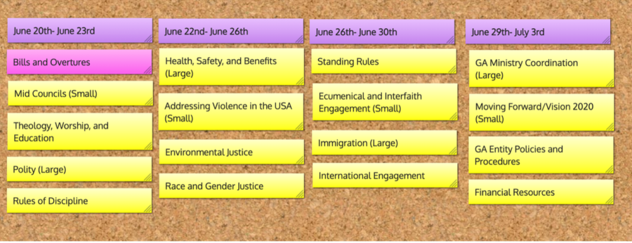 Deputy Stated Clerk Kerry Rice said OGA leaders tried to think of the committees in some different ways for this assembly than has typically been done in the past. For example, committees working on budget issues are scheduled to meet during the last block — recognizing that some work of other committees might have financial implications.