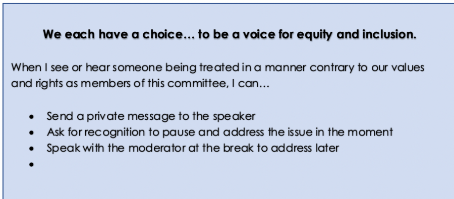 How can commissioners and advisory delegates hold themselves accountable for being equitable? And how should they respond in situations where they sense that’s not happening – for example, where someone isn’t being treated with respect or are given a chance to speak?