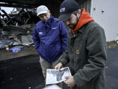 As the sun set and temperatures dipped into the 30s on Saturday, Mills and his brother Stuart tried to make quick work of salvaging items from the remains of the building at the corner of Broadway and 9th Street in this town of just over 10,000 people in the southwest corner of Kentucky. They pulled out tables, chairs, documents like an old black-and-white photo of the church building, and a framed letter describing how the church was the first religious organization in Mayfield, established in 1832, and that in 1915, “a new and most beautiful building was completed to meet the demands of the growing organization.”