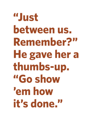 Mr. Jamison shook his head. “Just between us. Remember?” He gave her a thumbs-up. “Go show ’em how it’s done.”