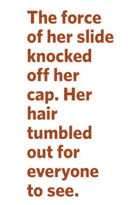 But the force of her slide knocked off her cap. Her hair tumbled out for everyone to see.