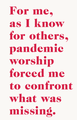 And yet, for me, as I know for others, pandemic worship forced me to confront what was missing. I could get through the week – exhaustingly, distractedly – pinging between meetings and young children, hunkering down at home, answering questions on a call, waving to neighbors at a distance. But, on Sunday, I was forced not just to acknowledge, but to linger in the physical absence of the worshipping community. No matter how strong my theology, this truth was unavoidable: the voice of the people was missing from