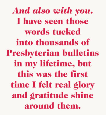 And also with you. I have seen those words tucked into thousands of Presbyterian bulletins in my lifetime, but this was the first time I felt real glory and gratitude shine around them. And also with you. Even masked and distanced, the congregation revealed something of the promise and presence of the Lord. The voice of the people had been erased from our pews. Now it had returned. And also with you.