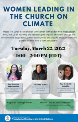 The webinar, featuring the Rev. Dr. Neddy Astudillo, the Rev. Mamisoa Rakotomalala and Yolanda Zurita, will be from 1-2 p.m. Eastern Time on Tuesday, March 22, on the Facebook page of the Presbyterian Ministry at the United Nations. Anyone who is interested can register for the event (go here), and Spanish interpretation will be available.