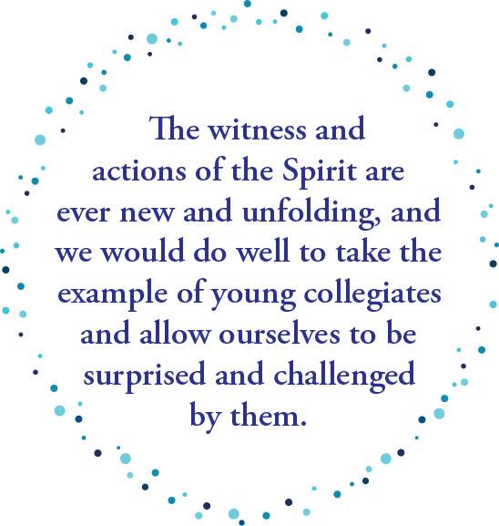 Our hope on a liberal arts campus is to foster a commitment to lifelong learning and transformation, which I believe is more a walk into faith than a mere academic inquiry. At our best, we acknowledge that we are students for all our lives, receptive to what God might be up to in spite of our assumptions, eisegesis or privilege. The witness and actions of the Spirit are ever new and unfolding, and we would do well to take the example of young collegiates and allow ourselves to be surprised and challenged by them. A professor of mine made the cheeky remark that “the Spirit is not house-trained,” but this can be easy for us to forget in the ecclesiastical community. It can be a great temptation to assume that the third member of the triune God is a kind of possession, something that we can carefully acknowledge in our bright red Pentecost banners only to tuck it away again until we take it back out for the next liturgical year.