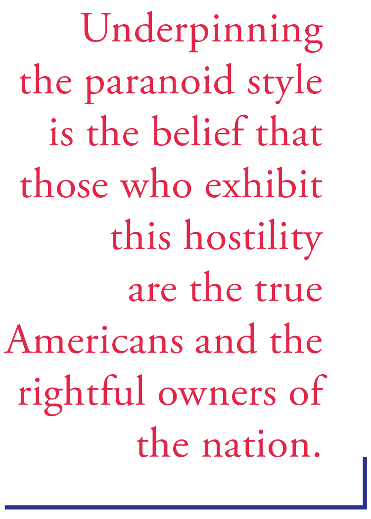 Underpinning the paranoid style is the belief that those who exhibit this hostility are the true Americans and the rightful owners of the nation. Although political paranoia has been with us from the beginning, the mid-20th century saw a significant transformation in the paranoid style on the political Right. Adherents of the Right began to see themselves as dispossessed. Its proponents were no longer defending what was actively theirs, because they no longer perceived themselves to be in power. Rather, they saw conspiracies arising not from marginalized outsiders but from insiders — the powerful, even the government.