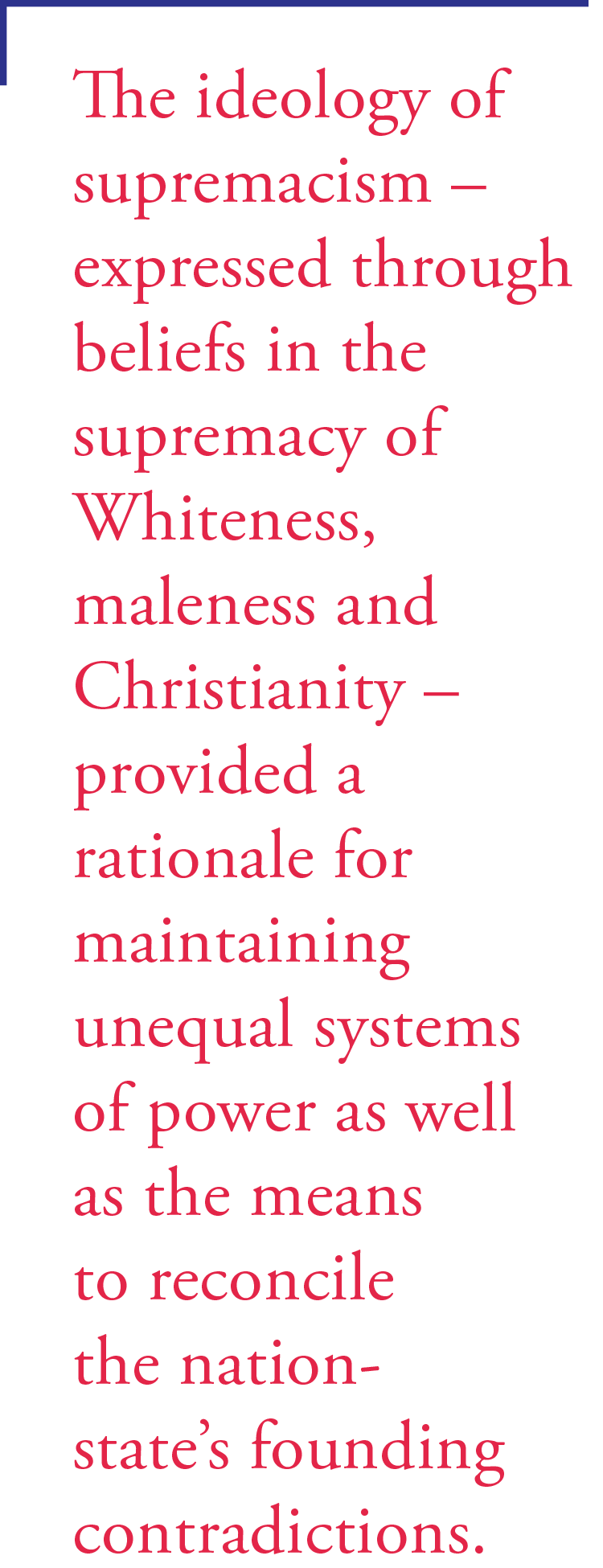 The ideology of supremacism – expressed through beliefs in the supremacy of Whiteness, maleness and Christianity – provided a rationale for maintaining unequal systems of power as well as the means to reconcile the nation-state’s founding contradictions. In other words, the paranoia-inducing status anxieties that Hofstadter described can be explained as the necessary product of the institutional organization of the state.