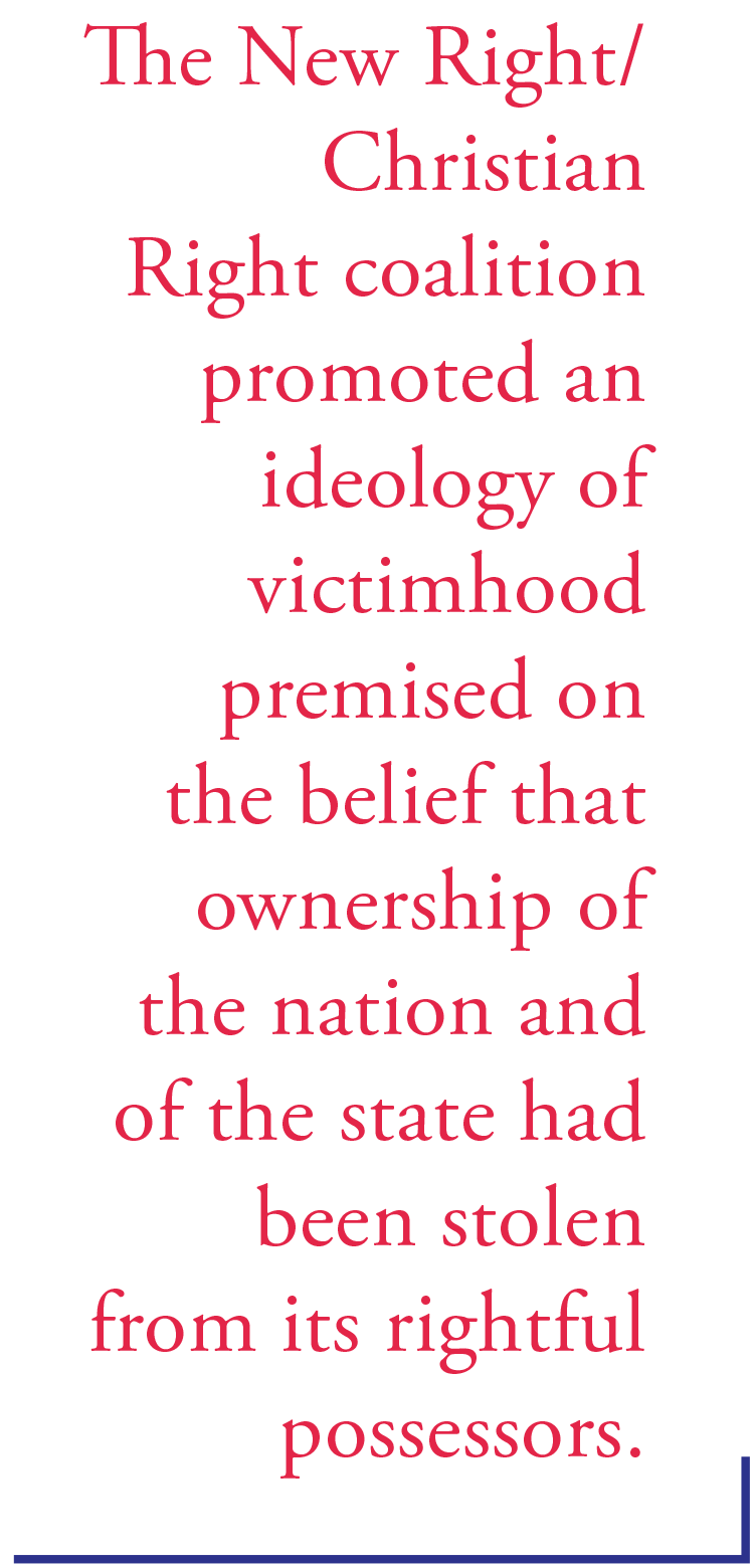 The New Right/Christian Right coalition promoted an ideology of victimhood premised on the belief that ownership of the nation and of the state had been stolen from its rightful possessors. The two groups worked successfully to cast the transformation of the original nation/state contradiction (and their perceived resulting loss of power and privilege) as an illegitimate assault by outsiders-turned-insiders. In this way, the New Right/Christian Right reframed domination as self-defense.