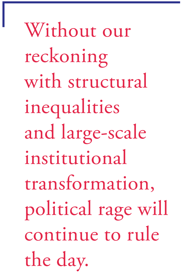 But as the targets of that rage have been brought inside the political system, the rage that has historically been directed at unequal political institutions is no longer on the margins. Our failure to meaningfully remake political institutions has promoted and maintained systems of oppression. Without our reckoning with structural inequalities and large-scale institutional transformation, political rage will continue to rule the day.