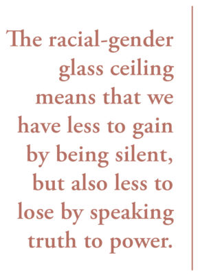 These are qualities valuable to institutions that are serious about change. But even among willing participants, change is difficult. Rarely are our White colleagues prepared for the increased discomfort that our voices bring. They are not ready for us to point out the problems we see in their long-cherished traditions and procedures — the inherent cultural biases and assumptions, the patterns of exclusion and privilege, and the gaps between what the institution claims to value and what it actually practices. They are not ready for what we say, how we say it or the fact that we say it at all. Our divergence is read as disruptive. Our voices are seen as threats to interpersonal relationships and institutional power.