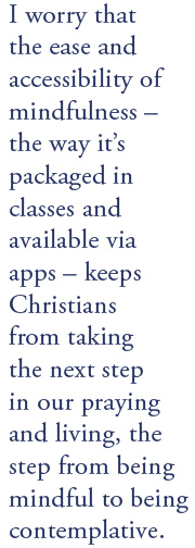 I worry that the ease and accessibility of mindfulness – the way it’s packaged in classes and available via apps – keeps Christians from taking the next step in our praying and living, the step from being mindful to being contemplative.