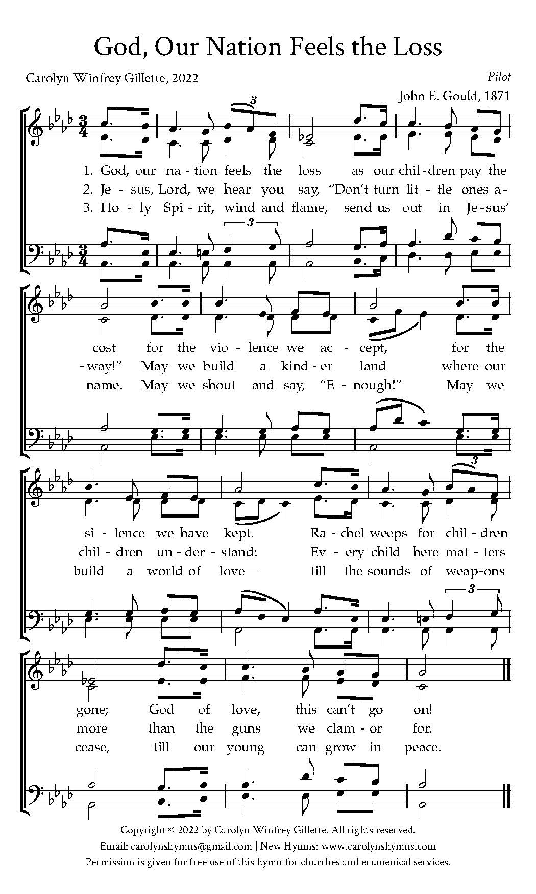 Permission is given for free use of this hymn, including in online worship services. For sheet music: God, Our Nation Feels the Loss.