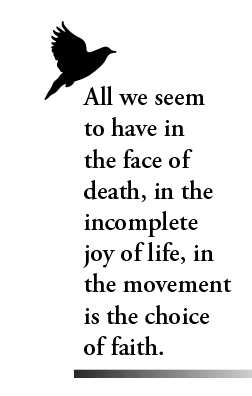 All we seem to have in the face of death, in the incomplete joy of life, in the movement, is the choice of faith. Faith that, ultimately, there is goodness — located in eternity, yes, but also now in our pain and isolation. We are not alone in the haze.