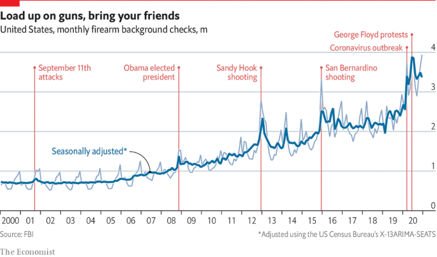 The increase in firearm sales over the last 20 years: