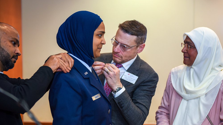 Friends and family members of Chaplain Candidate Saleha Jabeen pin on her second lieutenant rank during a commissioning ceremony, Dec. 18, 2019, at the Catholic Theological Union in Chicago. Jabeen is the first female Muslim Chaplain in the Air Force and Department of Defense. (U.S. Air Force photo/ Tech. Sgt. Armando A. Schwier-Morales)
