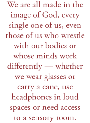 Despite the safe harbor of my church, I still grew up looking different from the other kids and had to wrestle with all the social trauma that comes with that. I am deeply familiar with doubting my own self-worth. Whenever I do, I return to Genesis 1:27: “So God created humankind in his image, in the image of God he created them.” We are all made in the image of God, every single one of us, even those of us who wrestle with our bodies or whose minds work differently — whether we wear glasses or carry a cane, use headphones in loud spaces or need access to a sensory room.