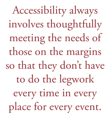 Accessibility always involves thoughtfully meeting the needs of those on the margins so that they don’t have to do the legwork every time in every place for every event. Living with a disability is isolating and exhausting. There is so much ground that we have to plow ourselves because no one is going to do it for us. Or at least that is what the world tells us. But what if there was just one place where we were loved enough that we didn’t have to do it all ourselves?