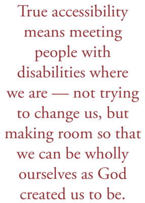 True accessibility is making room for those with additional needs within our communities: physically, theologically, socially and culturally. That means meeting people with disabilities where we are — not trying to change us, but making room so that we can be wholly ourselves as God created us to be. And when we all journey alongside one another, we find that we’re not really all that different