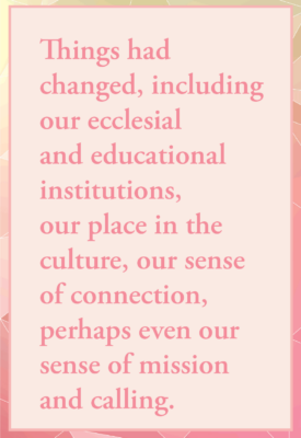 Denominational membership statistics reflected a steady decline. That was concerning. But thinking about the future was about more than numbers. The conversation included our next mission, our next vision. Just as we would not go back on ordination, we knew the church couldn’t move backwards. This was not about nostalgia. Things had changed, including our ecclesial and educational institutions, our place in the culture, our sense of connection, perhaps even our sense of mission and calling.