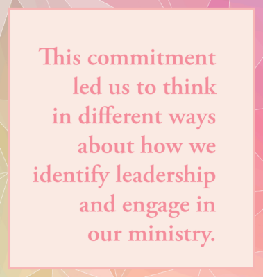 In our 2015 Strategy Team (board) meeting, following discussion, we committed to having 50% of our Strategy Team be reflective of communities of color. That was an important, if not imperfect and incomplete, move for us. This commitment led us to think in different ways about how we identify leadership and engage in our ministry.