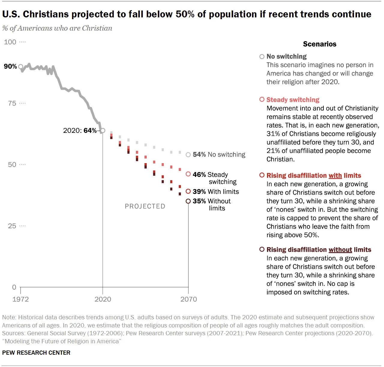 If all switching came to a halt, then Christians would remain a slight majority (54%), while nones would make up 34% of Americans, according to the projection model.