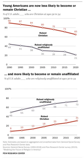 Currently, about a third (31%) of Christians become disaffiliated before they turn 30, according to Pew Research. Twenty-one percent of nones become Christian as young adults. Should those switching rates remain stable, Christians would make up 46% of the population by 2070, while nones would make up 41% percent of the population.