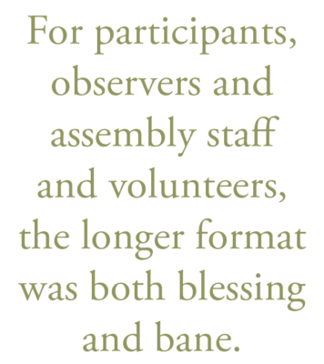For participants, observers and assembly staff and volunteers, the longer format was both blessing and bane. The blessing came in the form of committees having adequate time to consider, debate and vote on all the items in their purview. The bane was the duration and staggered meeting schedule of the assembly. One issue confronting many participants, which contributed to some presbyteries having difficulties filling General Assembly roles, was commissioners and advisory delegates were required to block off the entire three weeks of the assembly on their calendars, not knowing beforehand their committee assignment and the four-day block during which they would be required to travel to Louisville.