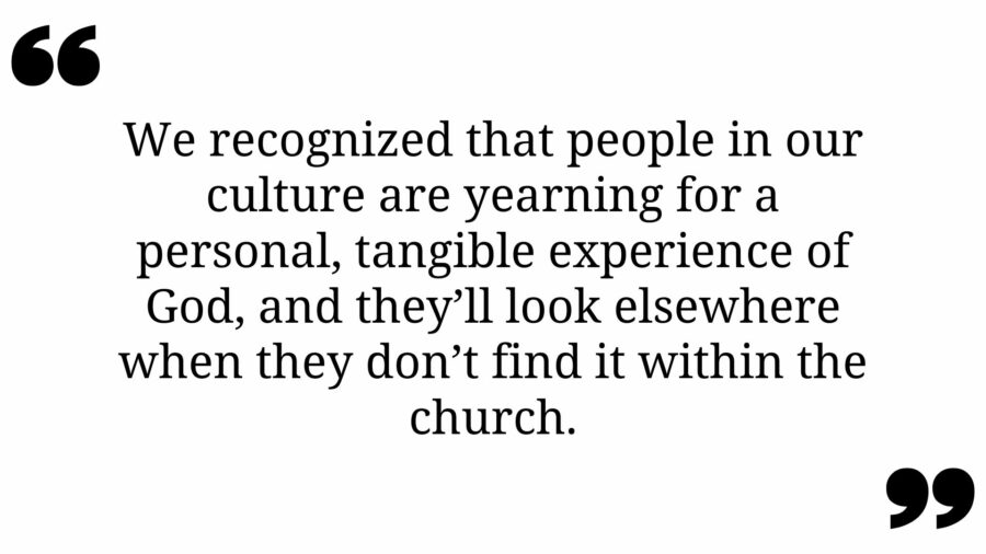 That sounds a bit nebulous since people are always having experiences. What was different? We recognized that people in our culture are yearning for a personal, tangible experience of God, and they’ll look elsewhere when they don’t find it within the church.