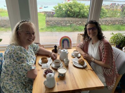 Right before I left the island, Catherine let me borrow a dress (the clothes I had packed were functional for travel and housekeeping) and we shared a cream tea together at the Argyll Hotel. She gave me a beautiful gift — a rainbow to hang on my office wall with a reminder of one of the songs we sang several times in worship: “Walk with me, for the journey is long.” I hung this gift in a prominent place in my office, and when I see it, I not only think with fondness about my friend, but I consider how, now that I’m back in my busy routine, I will walk with my trans siblings in Christ, with love and no longer in silence.