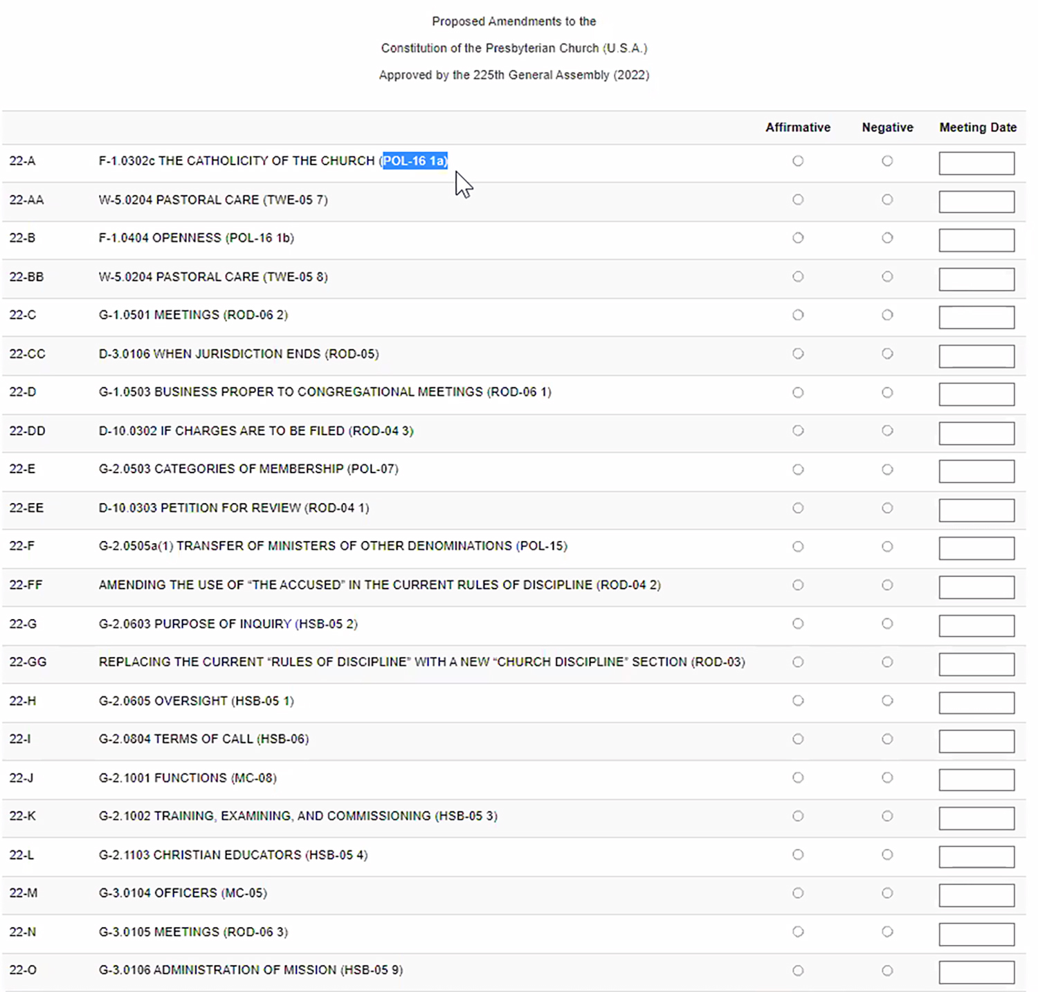 Trigger-Duffert had explained that stated clerks will handle votes at presbyteries. Sharing her screen, she showed the amendments portal and where to record votes or find out the history of each amendment. Results do not have to be submitted at once by presbyteries, Trigger-Duffert said. She will share running vote totals with mid council leaders as votes arrive.
