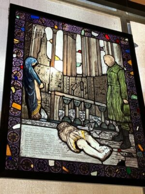 All 25 pieces have McDonald’s recollections of the various houses of worship worked into them in some way. In one made from glass recovered in Achen, Germany, the shards become a refugee’s suitcases under an inscription that reads, in part, “Down by the Cathedral, I saw an aged woman lugging two suitcases as she crawled over stone pilings. Where was she going with her pitiful burden?”