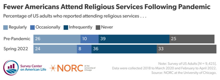 A new report, which looked at in-person worship attendance patterns before the beginning of the pandemic and in 2022, found that a third of those surveyed never attend worship services. That’s up from 25% before the start of the pandemic.