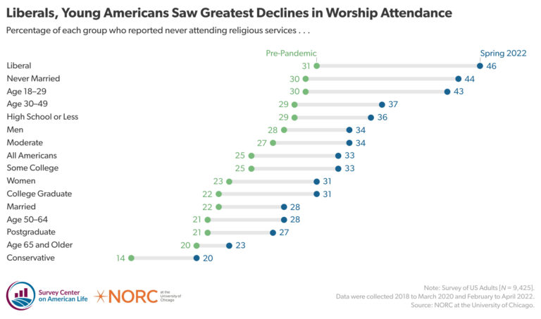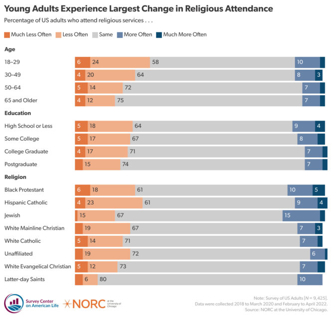 The report also noted the decline in attendance most affected groups that had already started to show a decline before the pandemic — particularly among younger adults, who were already lagging before the pandemic and showed the steepest drop-off since.
