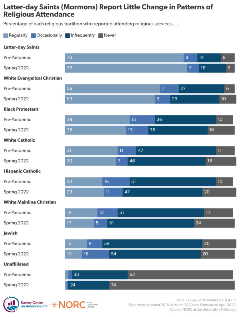 More than half of Latter-day Saints (72%) and white evangelicals (53%) said they attended service regularly in 2022, about the same rate as before the pandemic. Other groups saw little drop-off in regular attenders as well, including Black Protestants (36%), white Catholics (30%), Hispanic Catholics (23%), white mainliners (17%) and Jews (10%), all reporting similar regular attendance rates in 2022 as before the pandemic.