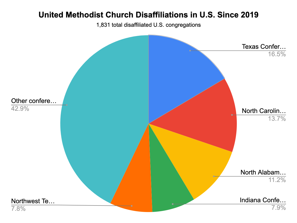 That analysis of data collected by the church’s General Council on Finance and Administration shows 6.1% of United Methodist churches in the U.S. — 1,831 congregations out of 30,000 nationwide — have been granted permission to disaffiliate since 2019. There are no good figures for international departures among the estimated 12,000 United Methodist churches abroad.