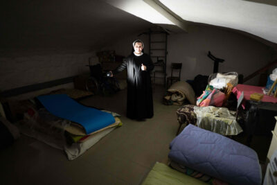 On our second day in Lviv, we interview internally displaced people (IDPs) housed at a Sisters of St. Basil (Basilian) convent. 19 people live there currently, including women with young children and a few older men, and a mother and four children will soon join the group, swelling the number to 24.