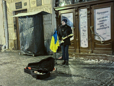 A man with an electric guitar and microphone sings in the main square as dozens of young people join him in song. We later find out these are old folk songs extolling the glory of Ukraine, resembling “This Land is Your Land” or “America the Beautiful” in their sentiment.