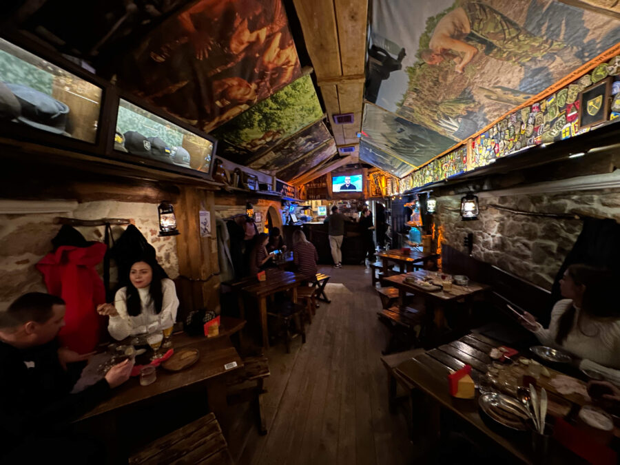 Kryivka is expansive. From the main room, the bunker veers left into several cavernous rooms, all similarly appointed as the main room. The place is packed, and the food is good. As a bonus, it serves as a bomb shelter when the air raid sirens sound.