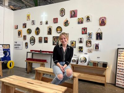 Soon, Morbitzer had transformed the second piece of wood into a modernized rendering of the Immaculate Heart of Mary. Those two pieces became the first of well over 100 modern saints Morbitzer has painted since. After graduating with a degree in interior design in 2020, she soon began creating modern saints full time in her Columbus art studio, where her walls are covered in small icons she’s hand-painted.