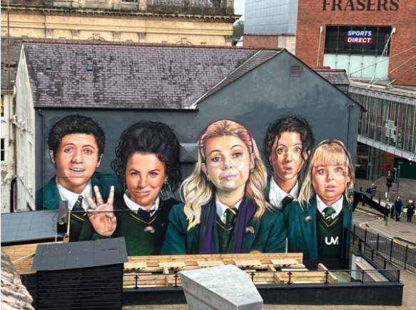 A mural in Derry commemorating the TV show 'Derry Girls,' which follows the lives of teenagers growing up amid Northern Ireland's troubles. (Dominic Bryan)