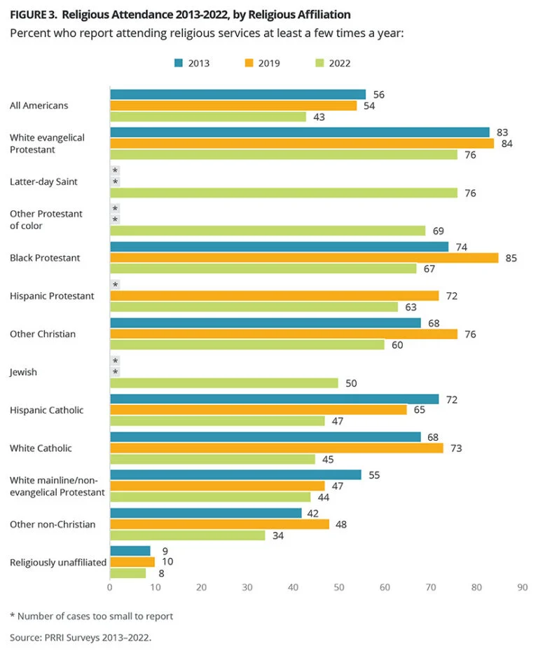 “What struck me about the findings is the paradox,” said Melissa Deckman, CEO of PRRI. “We see continued declines in the role of religion. But for those who attend regularly they seem pretty happy and satisfied, even proud of their congregations.”